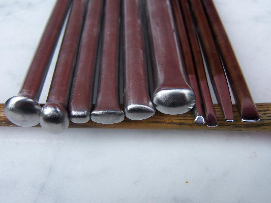 These tools are Mēgan’s exclusive and unique designs and consist of six repoussé punches, three undercutters and one liner. They are made by master tool maker Bill Dawson and available only through his website.
